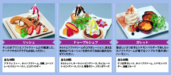ソフトクリームの販売に必要なコーン、ミックス、フリーザーがすべて揃います。お店に最適な多彩なメニュー展開を含め、二丸屋がトータルサポートいたします。